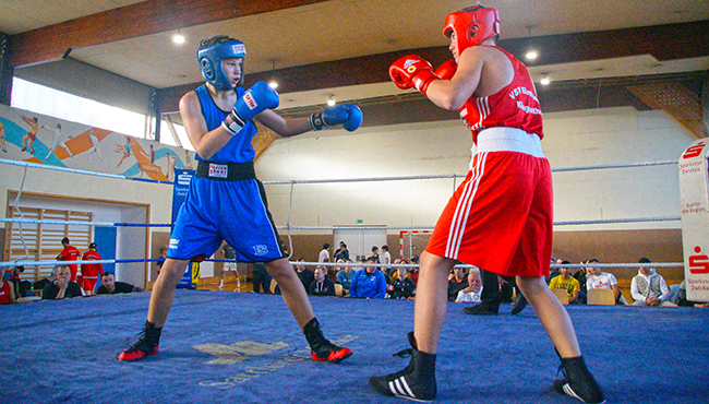 KSSV-Boxer Tymur Masharipov (in Blau in einem früheren Kampf gegen Elias Glazinski vom VSV Klingenthal) wird als Sachsenmeister und Teilnehmer der Deutschen Meisterschaft in der Altersklasse Kadetten (U15) einen Heimsieg anstreben. Foto: uhe