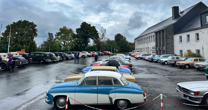 Ältestes Automodell war der Ford A Roadster mit seinem klappbaren sogenannten Schwiegermuttersitz aus dem Jahr 1930 von Dietmar Henschel aus Frohburg. Extravagante Ford-Oldtimer waren es insgesamt drei. Das Gros bildeten allerdings in Eisenach hergestellte Fahrzeuge und Mercedes-Modelle mit je vierzehn. Selbstverständlich dürfen im Teilnehmerfeld die Trabis nicht fehlen. Der von Jens-Uwe Bahr aus Dennheritz wird irrtümlicherweise kommentiert mit: „Da fehlen aber die runden Aufkleber von der GST oder NVA!“ Bein, fehlen nicht. Bahr erläutert. „Dieser Trabi lief 1979 als Kombi vom Band, landete bei einer LPG in Freital, die sich über den Maschinenbauhandel Karl-Marx-Stadt eine Kübelkarosse beschaffte und ihn bis 1984 so nutzte. Nach der Wende hab´ ich ihn 2005 per Zufall in Darmstadt entdeckt, ihm durch die VW-Lehrlingswerkstatt lediglich neue Farbe verpassen lassen. Eben dieses matte, für einen Kübel typische Grün. Seit 2015 bin ich mit ihm zu solchen Fahrten dabei.“