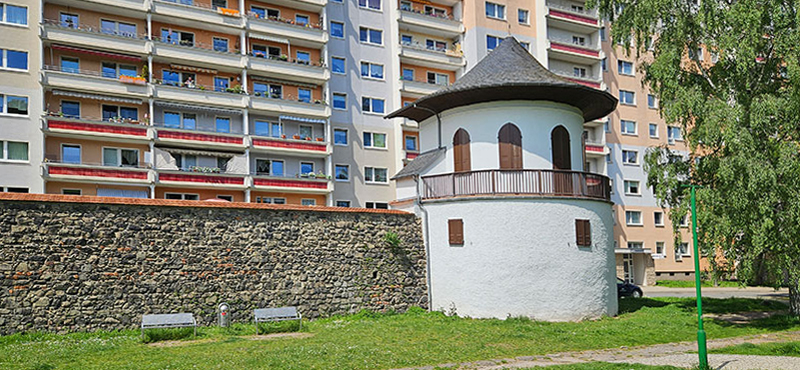 Der Pulverturm mit dem erhaltenen Mauerrest ist ein letzes Zeugnis der ehemaligen Zwickauer Stadtbefestigung. Ursprünglich durch Graben, Wall und Palisade befestigt, bezeugt die Tatsache, dass Zwickau 1430 erfolgreich einem Angriff der Hussiten trotzte, das Vorhandensein einer festgefügten steinernen Mauer.